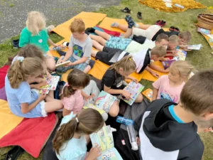 Biblioteka Komorzno zorganizowała „Czytanie na Polanie 2025” – akcję promującą czytelnictwo wśród dzieci na świeżym powietrzu w przyszkolnym ogródku.