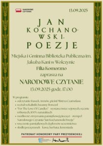 Dołącz do Narodowego Czytania poezji Jana Kochanowskiego w Komorznie. Zapraszamy czytelników i słuchaczy do wspólnej literackiej podróży.