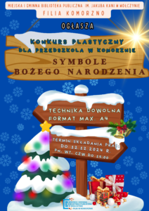 Miejska i Gminna Biblioteka Publiczna im. Jakuba Kani w Wołczynie, Filia Komorzno, zaprasza najmłodszych do udziału w konkursie plastycznym pt. „Symbole Bożego Narodzenia”. To wyjątkowa okazja, by przedszkolaki mogły zaprezentować swoje talenty artystyczne i odkryć magię świątecznych symboli! Szczegóły konkursu: Termin i miejsce składania prac: Prace można dostarczać do 12 grudnia 2024 roku w godzinach: … Continued