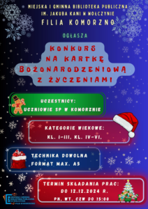 Miejska i Gminna Biblioteka Publiczna im. Jakuba Kani w Wołczynie, Filia Komorzno, zaprasza uczniów Szkoły Podstawowej w Komorznie do udziału w świątecznym konkursie na kartkę bożonarodzeniową z życzeniami. To świetna okazja, by stworzyć wyjątkową kartkę pełną świątecznej magii i ciepłych słów! Szczegóły konkursu: Termin i miejsce składania prac: Prace należy dostarczyć do 12 grudnia 2024 … Continued