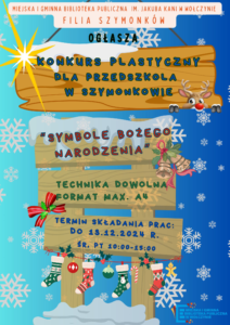 Miejska i Gminna Biblioteka Publiczna im. Jakuba Kani w Wołczynie, Filia Szymonków, zaprasza przedszkolaki do udziału w konkursie plastycznym pt. „Symbole Bożego Narodzenia”. To wspaniała okazja, by poprzez sztukę odkrywać piękno i magię świątecznych tradycji! Szczegóły konkursu: Termin i miejsce składania prac: Prace należy dostarczyć do 13 grudnia 2024 roku w godzinach: Zapraszamy wszystkie dzieci … Continued