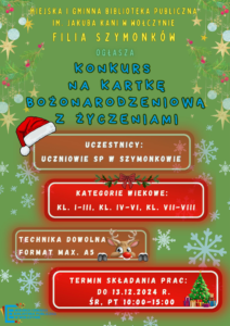 Miejska i Gminna Biblioteka Publiczna im. Jakuba Kani w Wołczynie, Filia Szymonków, serdecznie zaprasza uczniów Szkoły Podstawowej w Szymonkowie do udziału w konkursie na kartkę bożonarodzeniową z życzeniami. To doskonała okazja, by rozwijać kreatywność i poczuć świąteczną atmosferę! Szczegóły konkursu: Termin i miejsce składania prac: Prace można składać do 13 grudnia 2024 roku w godzinach: … Continued