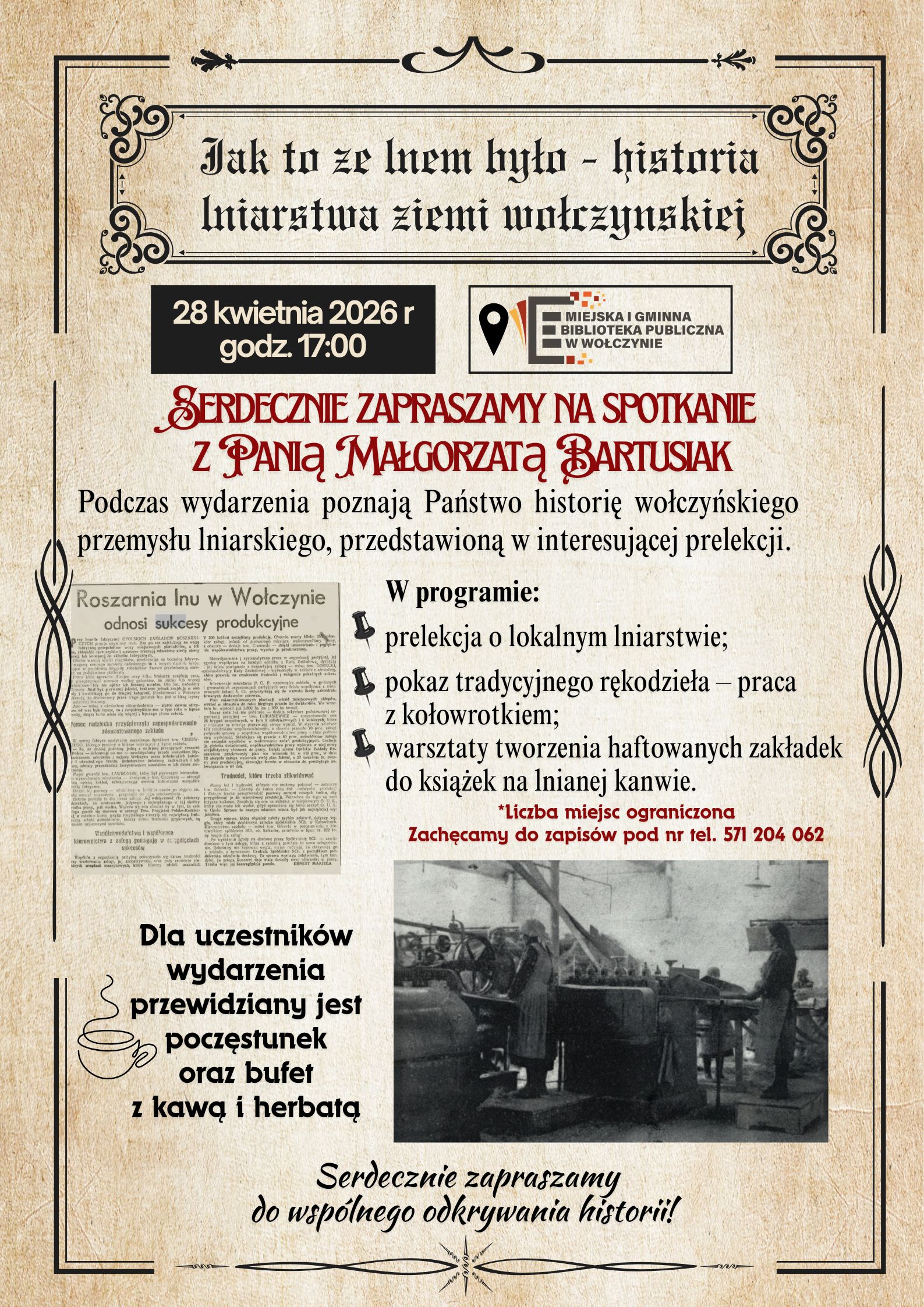 📌Serdecznie zapraszamy na bardzo interesujące spotkanie z Panią Małgorzatą Bartusiak -pasjonatką naszej lokalnej historii, która w niezwykle ciekawy sposób przybliży temat przemysłu lniarskiego naszego regionu.