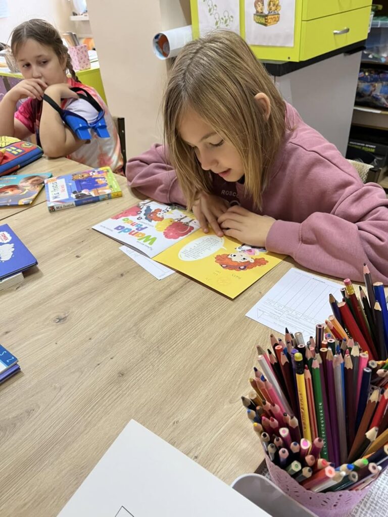 Dzieci z wielkim zainteresowaniem oglądały kolorowe i bogato ilustrowane książeczki. Nadia przeczytała bajkę „Wanda Panda wita Jesień”, która wprowadziła nas w jesienny nastrój. Na koniec uczniowie wykonali śliczne jesienne prace plastyczne!