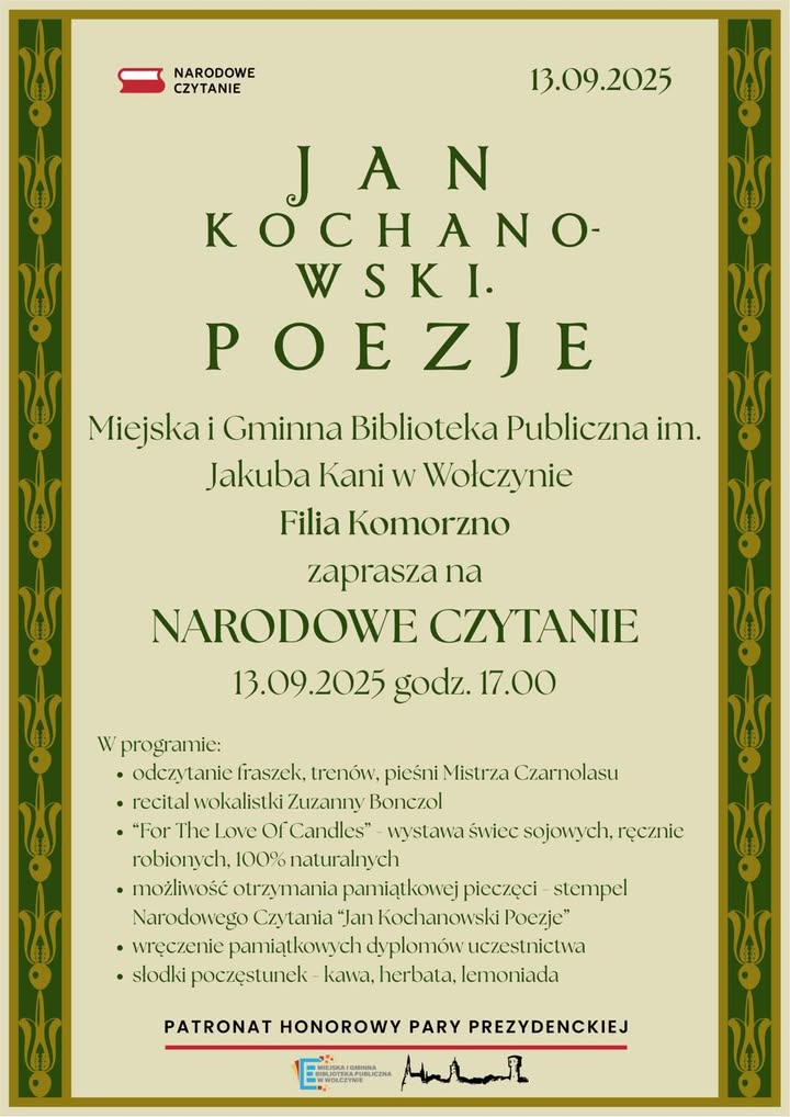 Serdecznie zapraszamy wszystkich miłośników literatury na wyjątkowe wydarzenie kulturalne – Narodowe Czytanie poezji Jana Kochanowskiego, uznawanego za mistrza słowa oraz ojca polskiej literatury renesansowej. To doskonała okazja, aby zanurzyć się w ponadczasowe dzieła jednego z najwybitniejszych polskich poetów i wspólnie celebrować naszą narodową spuściznę literacką.