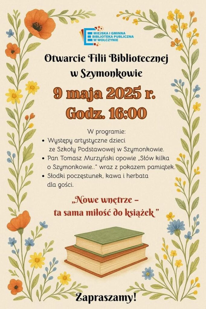 Z okazji Ogólnopolskiego Tygodnia Bibliotek, który w 2025 roku przebiegał pod hasłem „Biblioteka. Lubię tu być”, zaprosiliśmy wszystkich na uroczyste otwarcie odnowionej Filii Bibliotecznej w Szymonkowie. Wydarzenie odbyło się 9 maja o godzinie 16:00. W programie znalazły się: wystąpienie Pana Tomasza Murzyńskiego z opowieścią o historii Szymonkowa wraz z pokazem pamiątek oraz występy artystyczne dzieci z miejscowego Przedszkola i Szkoły Podstawowej. Nowe wnętrze, ta sama miłość do książek!