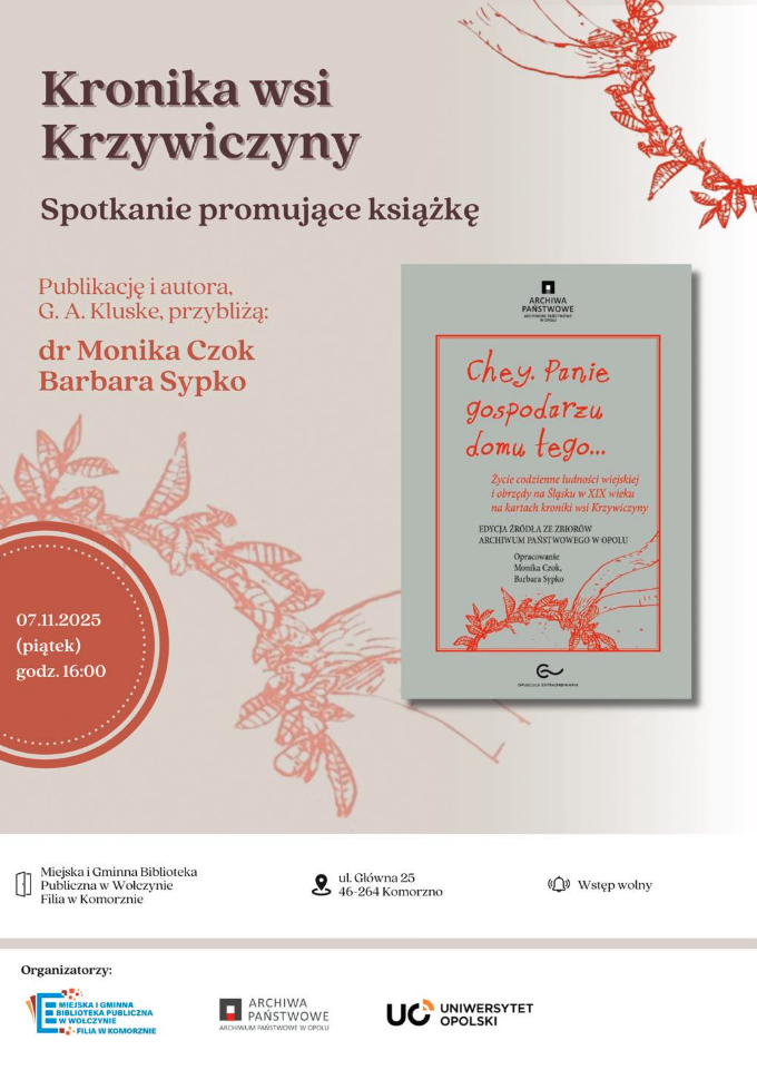 Głównym punktem spotkania będzie prezentacja książki pt. „Chey. Panie gospodarzu domu tego… Życie codzienne ludności wiejskiej i obrzędy na Śląsku w XIX w na kartach kroniki wsi Krzywiczyny”. Treść kroniki oraz sylwetkę jej autora, GA Kluske, przybliżą dr Monika Czok oraz pani Barbara Sypko. Kroniki te stanowią unikatowe źródło historyczne, pozwalające szczegółowo przyjrzeć się zwyczajom, obrzędom i codziennemu życiu mieszkańców wsi sprzed ponad wieku. Po wykładzie będzie możliwość zakupu książki w promocyjnej cenie.