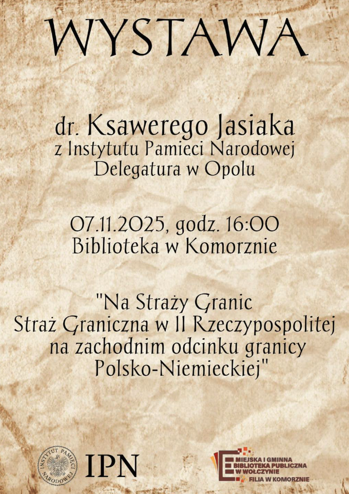 W ramach wydarzenia zaprezentowana zostanie także wystawa przygotowana przez dr Ksawerego Jasiaka z Instytutu Pamięci Narodowej Delegatura w Opolu, zatytułowana „Na Straży Granic. Straż Graniczna w II Rzeczypospolitej na zachodnim odcinku granicy polsko-niemieckiej”. Dr Jasiak opowie o historii placówek granicznych, które znajdowały się w bezpośrednim sąsiedztwie naszej miejscowości, co z pewnością zainteresuje wszystkich miłośników lokalnej historii.